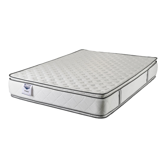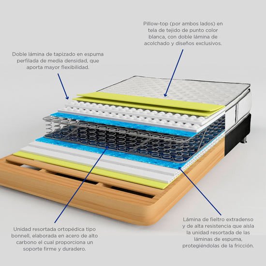 Colchón king ortopédico, estilo Pillow Top en ambas caras, con unidad resortada en acero de alto carbono y cámara de aire natural, espuma de media densidad adaptable al contorno del cuerpo para mayor confort. Incluye: 2 Almohadas.