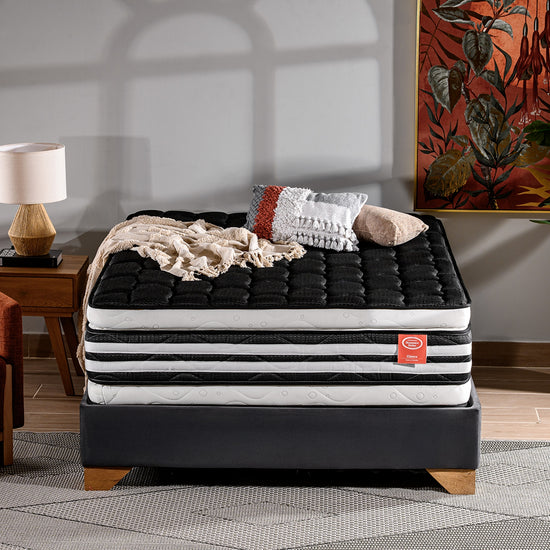 El Colchón Ónix Plus está diseñado con capas de espuma Ergofoam que aseguran la correcta postura de la espalda, distribuye el peso del cuerpo de forma uniforme, mejorando la calidad del sueño. Su diseño brinda una combinación ideal de confort y soporte, mientras que su altura de 40 cm le aporta presencia y elegancia. Cuenta con una firmeza media, perfecta para quienes buscan equilibrio entre suavidad y estabilidad.