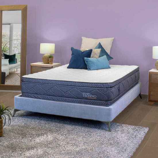 Sistema con doble pillow top para brindar suavidad al dormir con el soporte requerido, la mejor calidad de espuma flexible de poliuretano del mercado utilizada en diferentes zonas del cuerpo para mejorar la adaptabilidad del cuerpo, alternativa de uso doble cara.