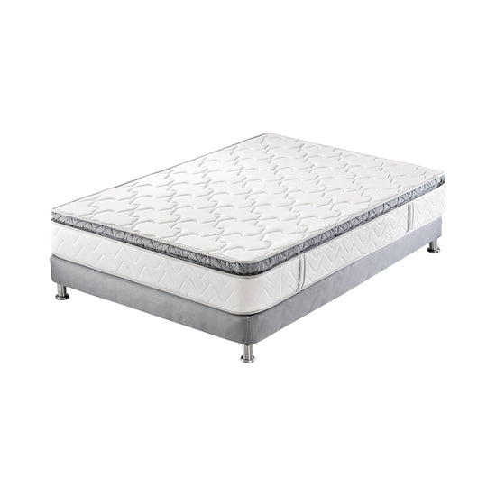 Colchón con núcleo de resortes tipo Bonnell que ofrece un soporte firme y constante. Sus capas de espuma de media densidad se adaptan suavemente al cuerpo, mientras la cubierta en tela satín aporta una sensación delicada y confortable al tacto.