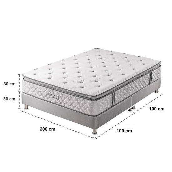 El combo Lexus Deluxe Pillow Top King ofrece amplitud, soporte y lujo en cada noche. Su colchón resortado tipo Bonell con sistema Pillow Top brinda comodidad y frescura. La base cama par en madera con patas cromadas aporta elegancia y firmeza. Incluye una cómoda almohada y respaldo de 15 años de garantía para tu tranquilidad.