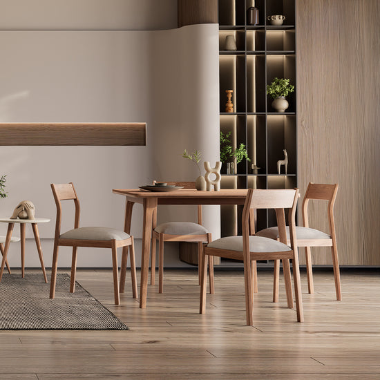 Comedor 4 Puestos Dalton con estructura elaborada en madera roble conocido por su durabilidad y su distintivo acabado. La cubierta en madera industrial añade un toque de modernidad y estilo. Con su apariencia su acabado único. Nuestras sillas tapizadas en tela suave al tacto, con un estilo elegante y moderno, diseñadas para combinar a la perfección con la mesa, creando una estética armoniosa en tu comedor.