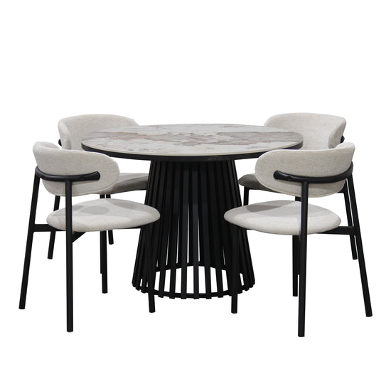 El Comedor 4 Puestos Donato Beige, Negro destaca por su diseño contemporáneo. Su base tipo jaula en color negro aporta carácter, mientras el sobre tipo mármol con vetas naturales añade sofisticación. Las sillas tapizadas con espaldar curvo brindan estilo y comodidad inigualable.