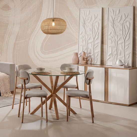Descubre nuestro comedor de 4 puestos con base redonda de vidrio y sillas curvas, diseñado para añadir un toque natural y elegante a tu espacio.