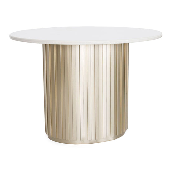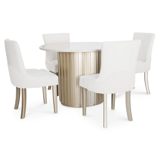Estilo refinado para tu hogar. El comedor Firence de 4 puestos combina una cubierta en madera industrial con pintura poliuretano de alto brillo, resistente al uso diario y de fácil mantenimiento. Su base cilíndrica acanalada en tono champagne agrega un toque de elegancia moderna. Las sillas, tapizadas en tela Eurolino de fácil limpieza, ofrecen comodidad superior y un acabado sofisticado.