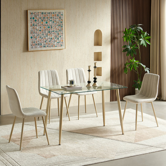 Vive los mejores momentos con nuestro comedor de 4 puestos con elegante base de vidrio y sillas tapizadas con líneas, ideal para espacios reducidos. Su diseño funcional añade estilo a tu hogar, ofreciendo un conjunto acogedor y versátil.