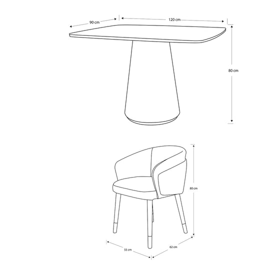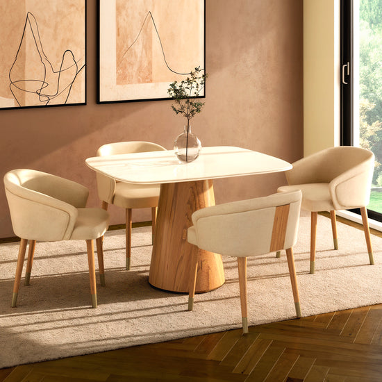 El comedor Milan está diseñado para brindar estilo y confort a tu hogar. Su mesa cuadrada combina una cubierta en madera industrial con una base cónica en madera roble natural, que aporta un toque contemporáneo y cálido. Las sillas, tapizadas en tela suave al tacto, incorporan detalles en madera vista que refuerzan la estética natural. Sus patas en tono roble con puntas dorada le dan un acabado sofisticado. Ideal para ambientes modernos y minimalistas donde se valora la funcionalidad sin perder elegancia.
