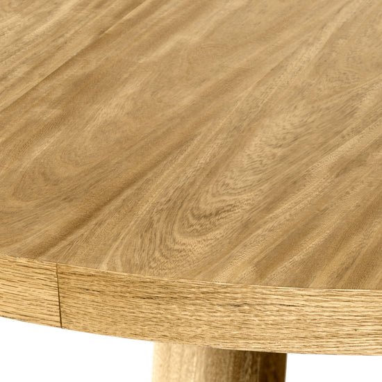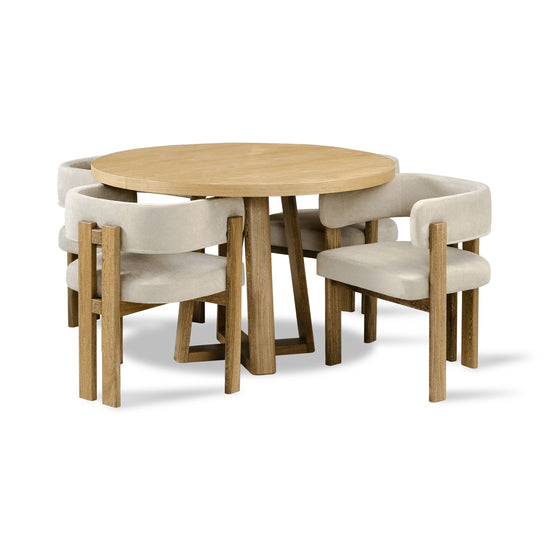 El comedor Sabina destaca por su diseño contemporáneo con sutil inspiración escandinava, logrando una estética moderna, funcional y elegante. La mesa, con cubierta circular, se apoya sobre dos pilares abiertos y asimétricos que aportan ligereza visual sin comprometer la estabilidad. Su estructura está fabricada en madera, lo que realza su calidez y durabilidad.