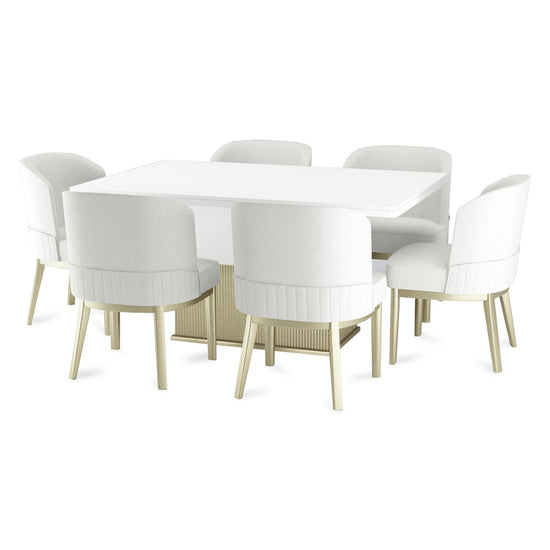Este elegante comedor de 4 puestos es perfecto para crear un ambiente acogedor y moderno en tu hogar. Su diseño combina funcionalidad y estilo, ofreciendo una mesa espaciosa y sillas cómodas con un toque de sofisticación. Las sillas están tapizadas en tela Eurolino, un material de fácil limpieza que aporta suavidad y resistencia, ideal para el uso diario. La estructura en color champaña añade un acabado elegante y versátil que se adapta a diferentes estilos de decoración.