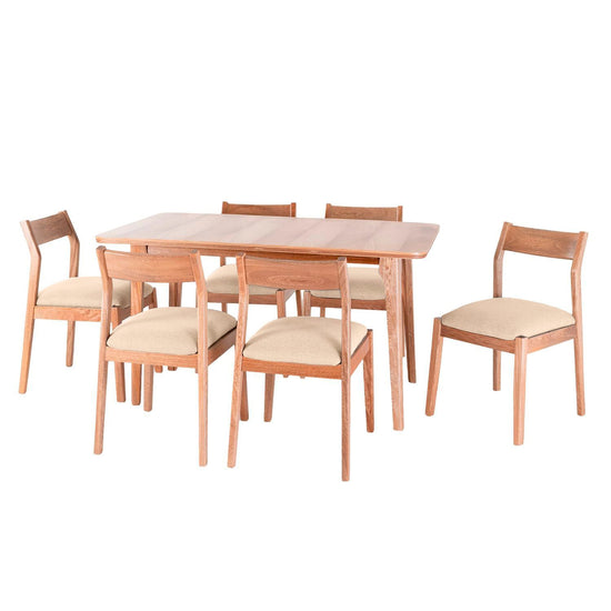 El comedor Dalton de 6 puestos combina diseño escandinavo y calidez natural. La mesa rectangular en roble macizo con esquinas redondeadas y patas anguladas aporta estilo y resistencia. Las sillas con espaldar en roble y tapizado en microfibra color almendra ofrecen elegancia y confort duradero.