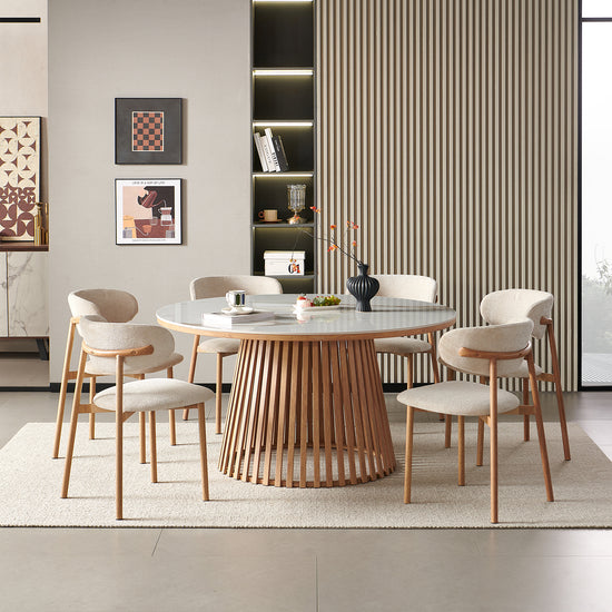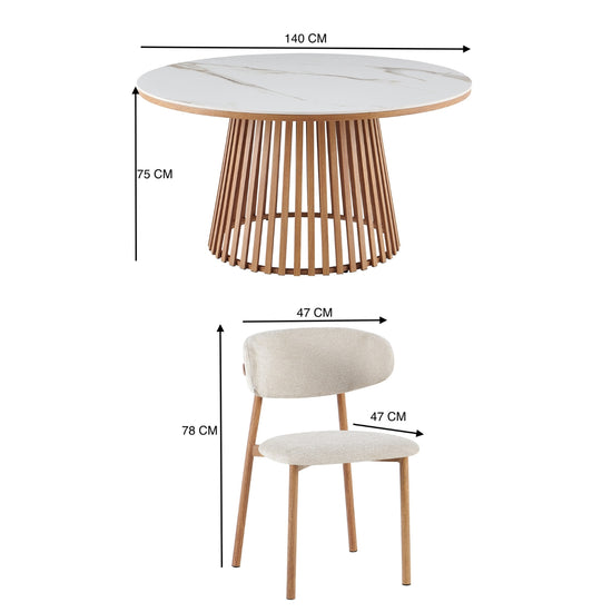 El Comedor 6 Puestos Donato Beige, Natural Sinterizado combina modernidad y resistencia con su cubierta de marmo sinterizado y base en tono madera natural. Las sillas tapizadas en beige ofrecen confort y elegancia, creando un espacio ideal para compartir y realzar el estilo de tu hogar.