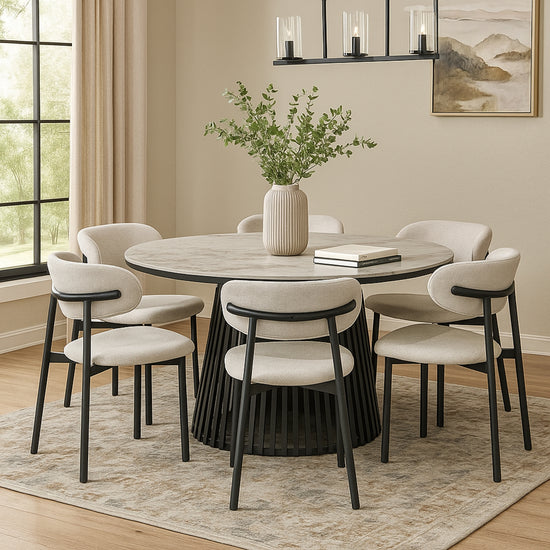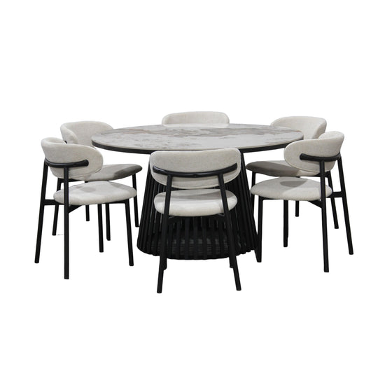 El Comedor 6 Puestos Donato Beige, Negro combina armoniosamente estética contemporánea y funcionalidad. Su cubierta con acabado marmoleado crea un efecto visual refinado, acompañado de sillas beige con diseño envolvente que elevan la experiencia de comedor con un aire acogedor.
