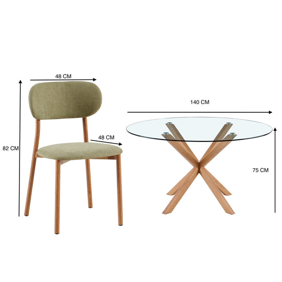El comedor Dousty verde natural de 6 puestos aporta frescura y personalidad a tu hogar. Su estructura en madera clara y sillas tapizadas en verde suave crean una atmósfera acogedora y natural. La mesa con cubierta de vidrio aporta sofisticación y hace que tu comedor luzca más amplio y luminoso.