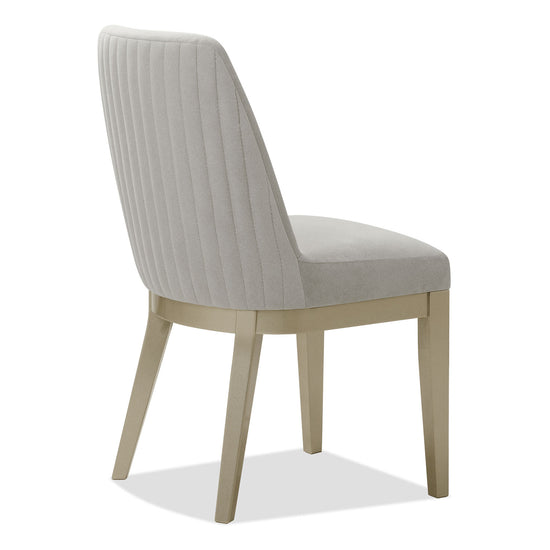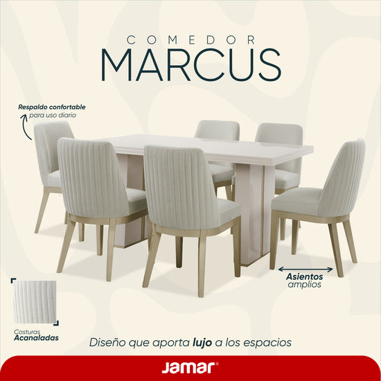 El Comedor Marcus fusiona lujo y sofisticación en su diseño. La mesa, con un acabado greige y detalles en champaña, un ruteado en el canto de la cubierta, y su base incorpora una incrustación que añade distinción. Las sillas, con respaldo curvo, complementan el estilo refinado de la mesa, creando una pieza única y glamorosa que transforma cualquier espacio con su aire moderno y elegante.