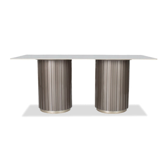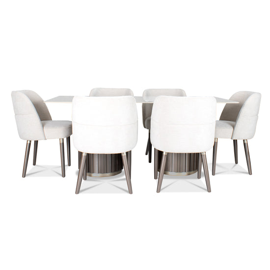 El comedor Nicole de 6 puestos es la fusión perfecta entre elegancia y confort. Su mesa rectangular presenta una sofisticada cubierta en acabado poliuretano, que aporta un brillo sutil y alta resistencia al uso diario. La base de diseño cilíndrico acanalado le da un toque arquitectónico único, convirtiéndola en el centro de todas las miradas, sillas tapizadas en tela suave al tacto de alto lujo.