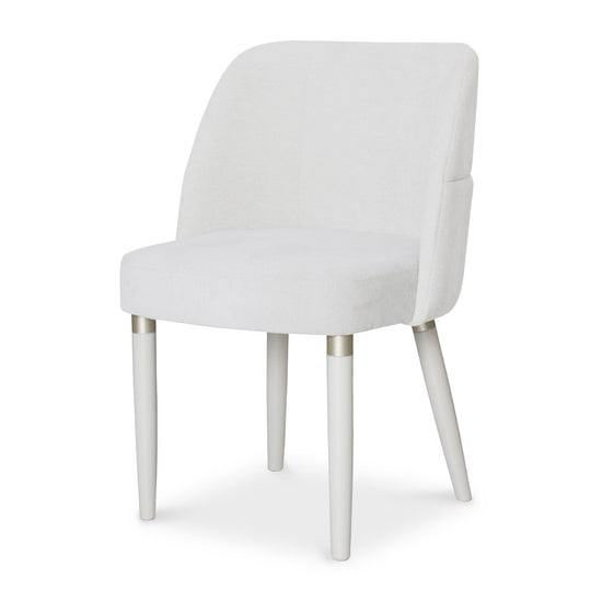 El comedor Nicole de 4 puestos combina elegancia y diseño glam. Su base cilíndrica alistonada en roble con acabado champaña aporta sofisticación, mientras que las sillas con espaldar curvo y tapizado en eurolino blanco brindan confort y estilo. Ideal para espacios modernos y acogedores.