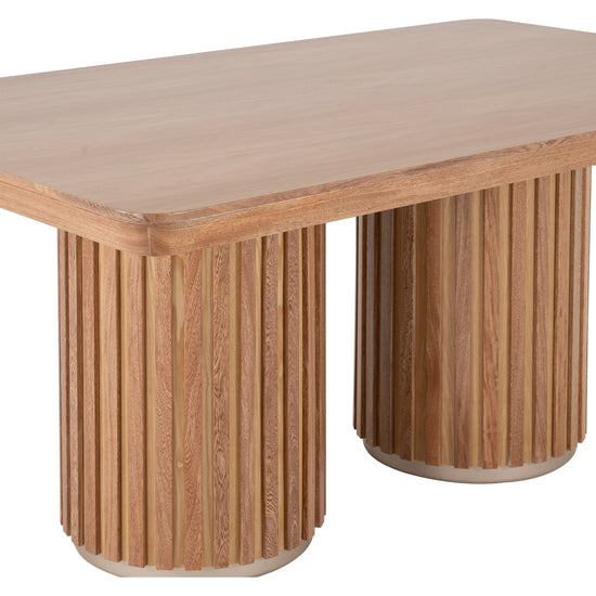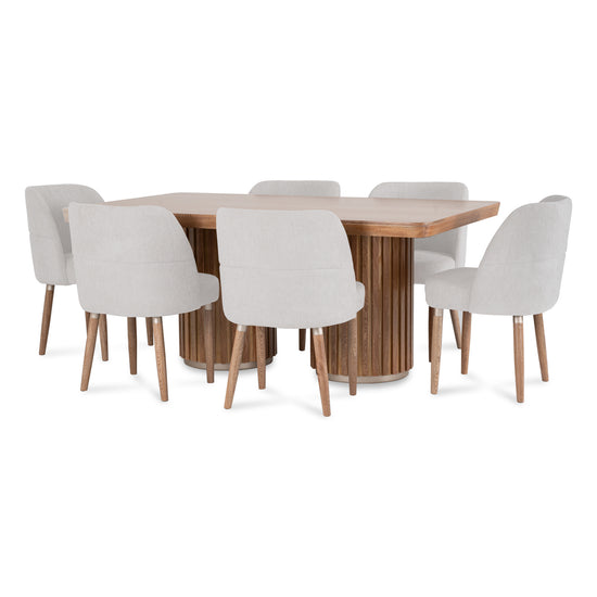 Descubre la elegancia contemporánea con nuestro Comedor 6 Puestos Nicole. Diseño único y moderno, las sillas presentan un espaldar curvo tapizado en tela suave tono plata, la base del comedor presenta un encantador diseño cilíndrico con acabado alistonado, aportando un toque distintivo a tu espacio. La estructura en madera de roble revestida en pintura poliuretano asegura una alta resistencia y durabilidad.