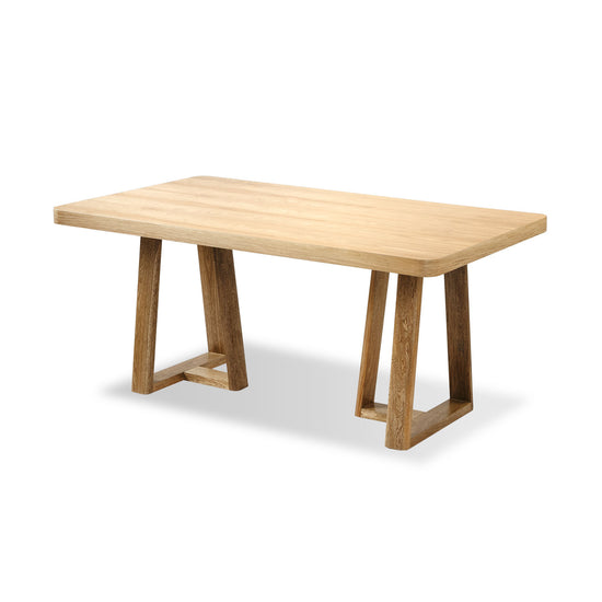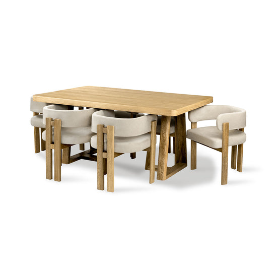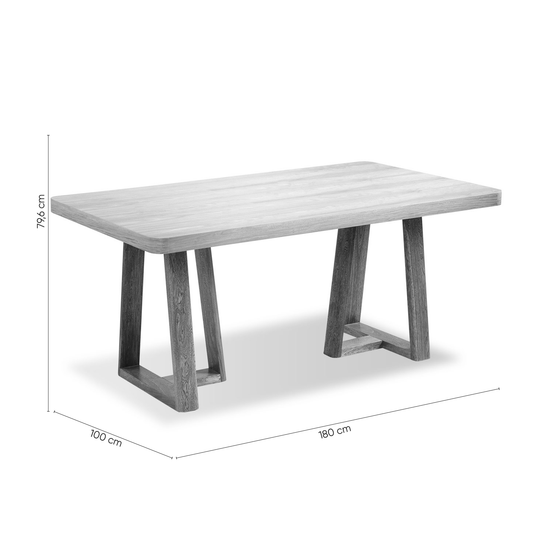 El comedor Sabina destaca por su diseño contemporáneo con sutil inspiración escandinava, logrando una estética moderna, funcional y elegante. La mesa, con cubierta rectangular, se apoya sobre dos pilares abiertos y asimétricos que aportan ligereza visual sin comprometer la estabilidad. Su estructura está fabricada en madera, lo que realza su calidez y durabilidad.
