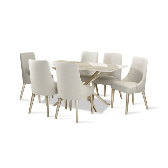 El Comedor 6 Puestos Sevilla es sinónimo de elegancia. Su mesa con base en acabado champaña y superficie de vidrio templado realza el diseño contemporáneo, mientras que las sillas tapizadas en eurolino blanco puro ofrecen comodidad y sofisticación. Perfecto para grandes reuniones, combina estilo moderno y funcionalidad en un solo ambiente.