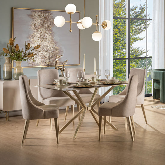 El Comedor Sevilla de 6 puestos combina estilo contemporáneo y modernidad. La mesa, con cubierta de vidrio efecto mármol, es ideal para uso exigente, mientras que sus patas metálicas con pintura electrostática ofrecen resistencia a la corrosión. Las sillas, tapizadas con una mezcla de texturas y líneas suaves, aportan lujo y elegancia a tu comedor.
