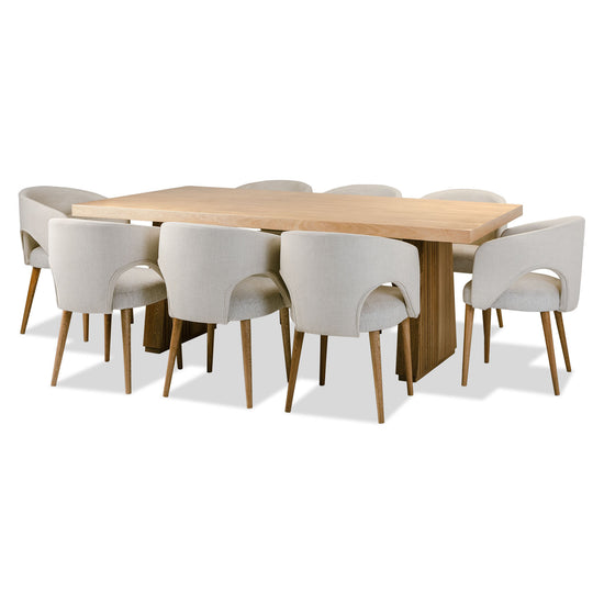Diseño cálido y contemporáneo que transforma tu comedor. El comedor Denver está compuesto por una mesa de madera con acabado en pintura poliuretano que realza la veta natural y aporta durabilidad y fácil limpieza. Su base con textura acanalada le da un toque arquitectónico único.Incluye ocho sillas con estructura en madera y tapizado en tela suave al tacto, que brindan máxima comodidad y elegancia.
