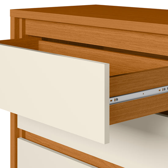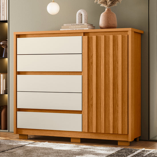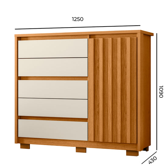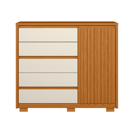 La Cómoda Berry es la solución ideal para quienes buscan un mueble elegante y práctico. Su estructura en MDP con acabado en pintura UV le otorga un estilo moderno y mayor resistencia. Diseñada para ofrecer amplio almacenamiento, cuenta con 5 cajones espaciosos y una puerta con listones y cierre suave, que oculta repisas internas para organizar tus pertenencias de manera eficiente.