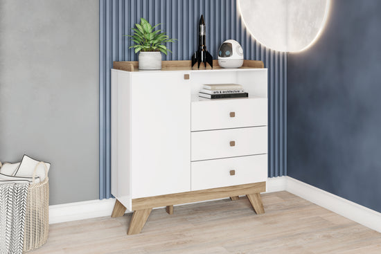 Cómoda con acabado en pintura UV, ideal para aquellos que buscan una solución práctica y elegante para guardar sus pertenencias en el cuarto de sus hijos. Cuenta con tres gavetas y una puerta abatible, con amplio espacio de almacenamiento para guardar todo lo que necesites, ya sea ropa, juguetes u otros objetos.