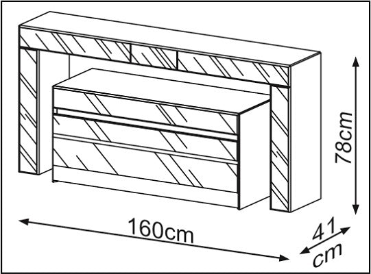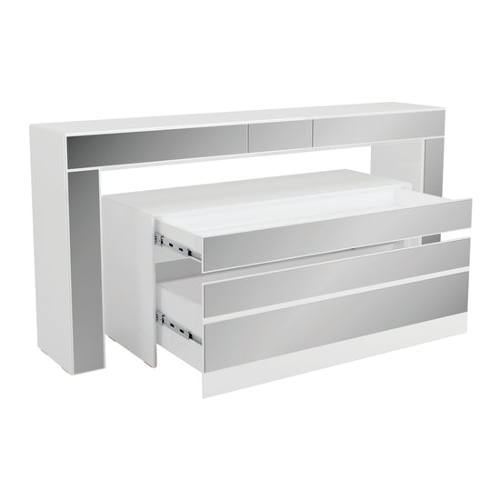 Consola elaborada en tablero de MDF/MDP de pino, con pintura UV color Blanco, espejos decorativos inscrustados, incluye mueble de 2 gavetas con rieles extensibles. Medidas: 78x160 cm. *Transporte y armado gratis.