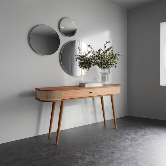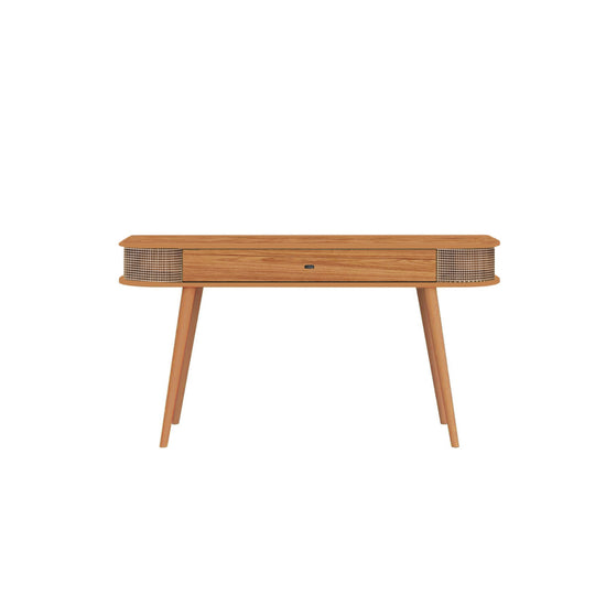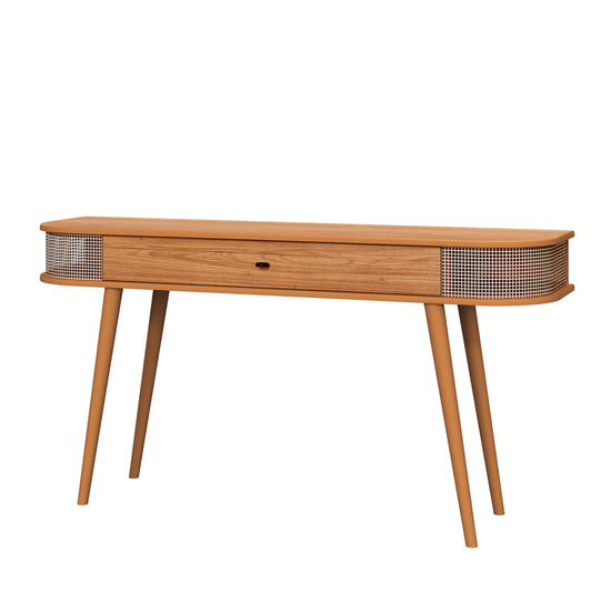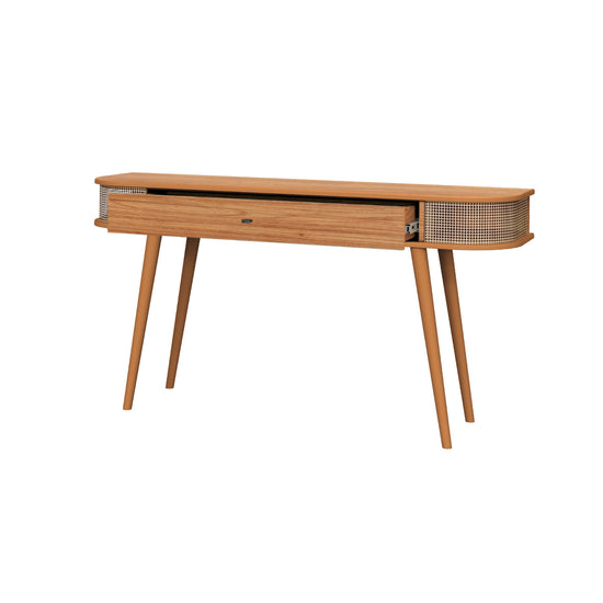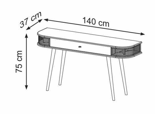 Consola elaborada en madera industrializada de pino y acabado en pintura UV que garantiza su durabilidad y resistencia, con detalles tejido en tela sintetica que añade un elemento visual único y crea una textura interesante y sofisticada, brindando un equilibrio entre delicadeza y modernidad. Cuenta con 1 gaveta con corredera metalica y patas en pino. Transporte y armado Gratis