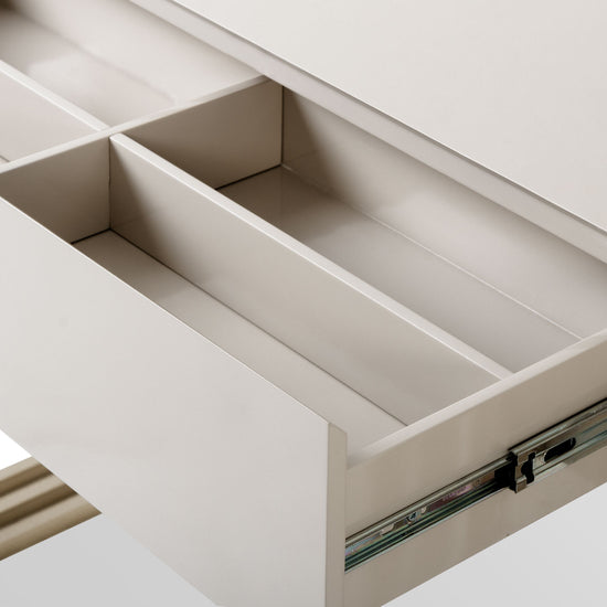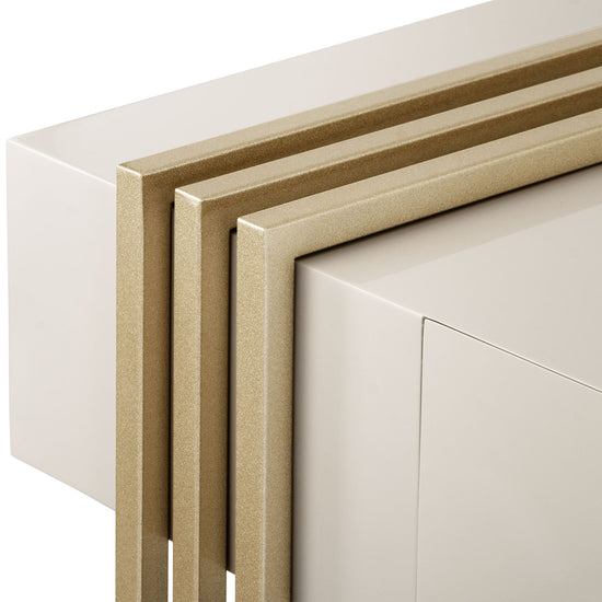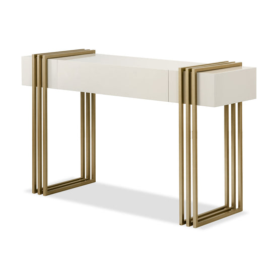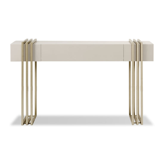 La Consola Manhattan Greige, Champaña Premium combina diseño moderno y lujo. Su estructura metálica con acabado champaña simula una viga arquitectónica, mientras que su cubierta en tono greige aporta sofisticación. Ideal como mesa auxiliar para realzar salas elegantes y funcionales.