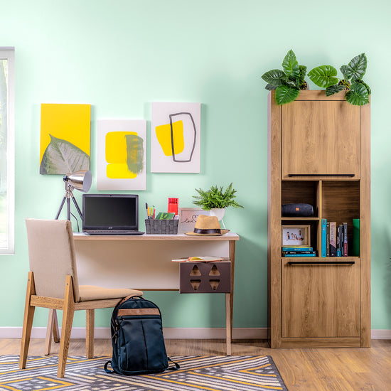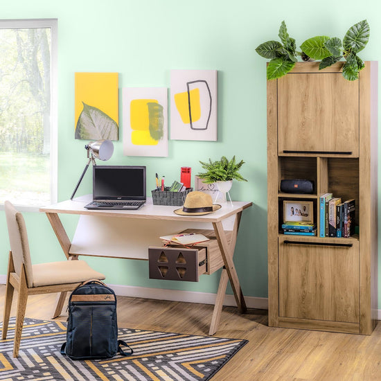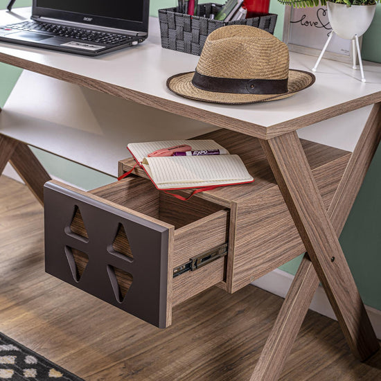 Mesa elaborada en tablero de MDF/MDP de pino en pintura UV color Natural con Blanco con 1 gaveta con detalles en negro y rieles extensibles. Medidas: 77x130 cm.*Transporte y armado gratis.