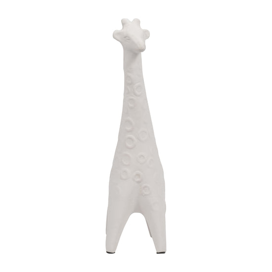 Una figura decorativa en forma de jirafa, delicadamente modelada en cerámica de acabado marfil. Su diseño único, con texturas sutiles en su cuerpo que imitan la piel de este majestuoso animal, aporta un toque minimalista y elegante a cualquier ambiente.