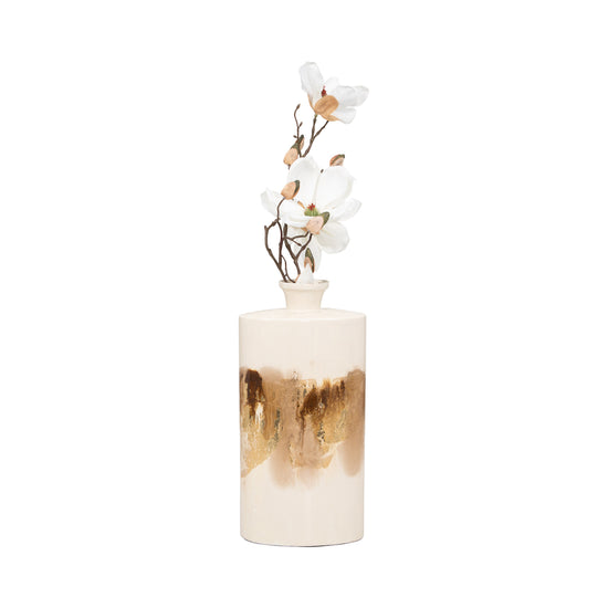El Jarrón 38X20 Dorado Perla es una pieza decorativa única que agrega un toque sofisticado a cualquier espacio. Con su elegante diseño en tonos dorados y perla, este jarrón cuenta con una textura artística que combina perfectamente con su forma cilíndrica.