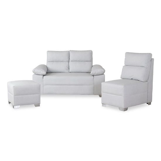 Dale más vida a tu hogar con este elegante juego de sala tapizado en tela Eurolino de fácil limpieza. Ideal para espacios reducidos, el conjunto incluye un cómodo sofá, un versátil puff y una acogedora butaca, añadiendo estilo y funcionalidad compacta a tu sala de estar.