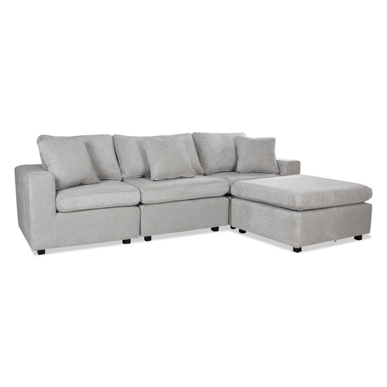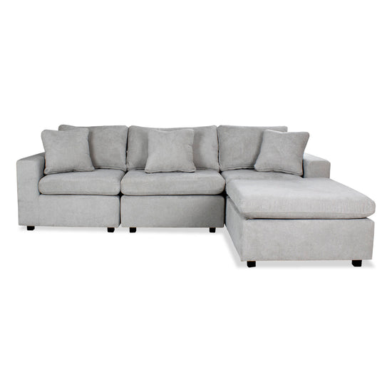 Dale a tu hogar un toque de sofisticación, comodidad y funcionalidad con este juego de sala. Su diseño modular permite adaptarla fácilmente a cualquier espacio, brindando una solución versátil y funcional, usa como safá en L o son sus módulos independientes.Tapizada en tela suave y resistente, color plata con asientos acolchonados de máximo confort y sus patas en negro que resaltan elegancia para tus espacios.