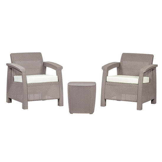 Juego de Sala set x 3, fabricado en polipropileno de alta densidad de fácil armado, terminado tipo rattan. Es un producto ideal para ambientar balcones, terrazas o jardines ya que cuenta con protección UV para rayos solares. Incluye dos sillones + 1 mesa de centro con tapa. Medidas: (AltoxAnchoxProfundo). Mesa: 42 X 42 X 42 .
