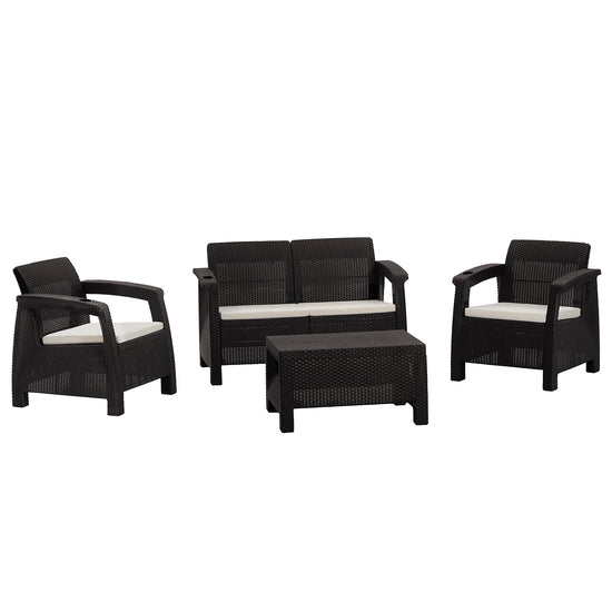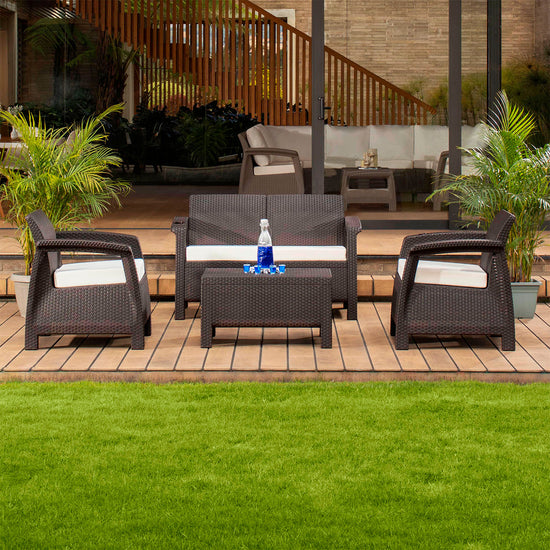 Este Juego de Sala es una opción versátil para disfrutar al aire libre, elaborado en polipropileno de alta densidad que garantiza resistencia. Su acabado de tipo rattan le confiere un aspecto elegante y moderno, con acabado de protección UV asegura muebles para uso en exteriores, proporcionando durabilidad frente a la exposición al sol. Este conjunto incluye un sofá de dos puestos, dos sillones individuales y una mesa de centro, lo que lo convierte en una solución completa para cualquier espacio al aire libre. Ideal para balcones, terrazas o jardines, este juego de sala añade comodidad y estilo a cualquier entorno exterior.