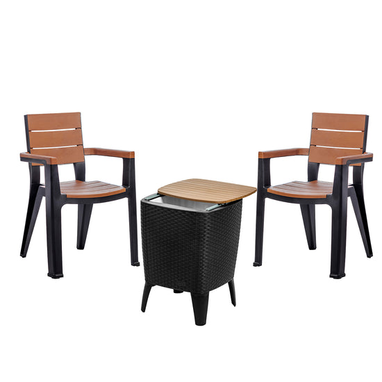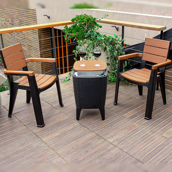 El set x3 de muebles para exterior Madeira, elaborado en polipropileno de alta densidad, se destaca por su facilidad de armado y durabilidad. Perfecto para balcones, terrazas o jardines, este conjunto cuenta con protección UV para resistir los rayos solares. Incluye dos sillas Madeira con brazo textura tipo madera, junto con una mesa hielera cooler, asegurando frescura para tus bebidas mientras disfrutas al aire libre.