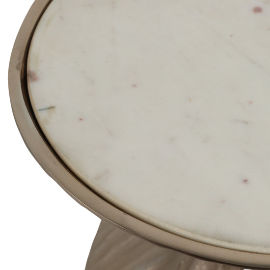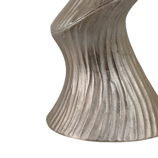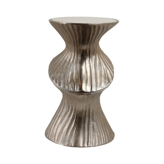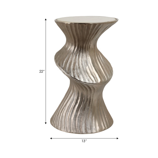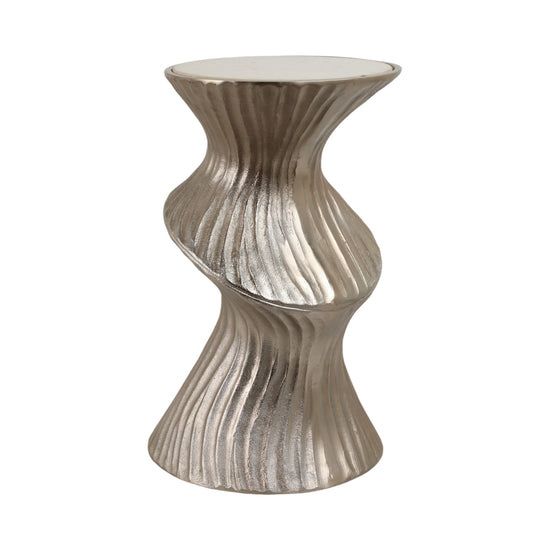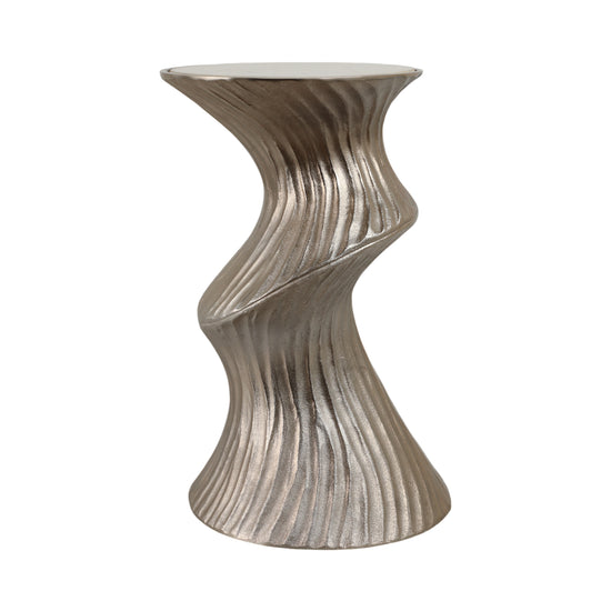 La Mesa Esquinera Aqua Dorado destaca por su diseño ondulado y acabado metálico brillante. Su forma orgánica y textura fluida aportan movimiento visual, convirtiéndola en una pieza decorativa ideal para espacios modernos y sofisticados.