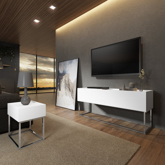 Mesa elaborada en tablero de MDP de pino con Pintura UV color Blanco, acabado semimate y estructura en metal cromado, incluye 1 gaveta con corrediza telescópicas.*Transporte y armado gratis.