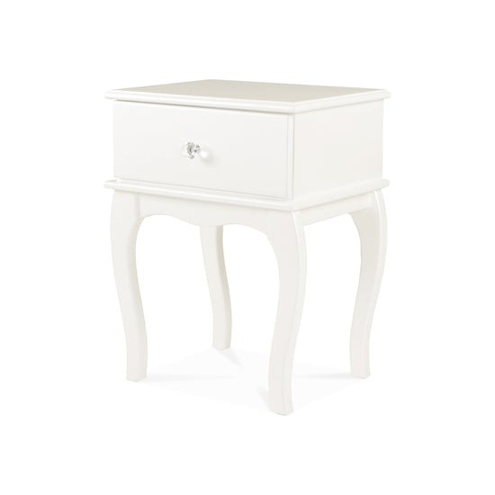 Mesa con estructura elaborada en madera de roble, acabado Perlado color Blanco Perla, material antiplagas de fácil limpieza, pintura con excelente conservación del color en el tiempo, manijas metálicas, cajon con rieles extensibles para almacenamiento extra Medida: 40X34 cm.
