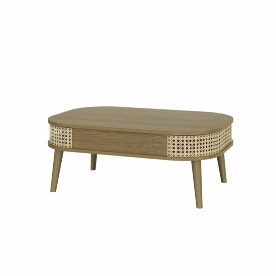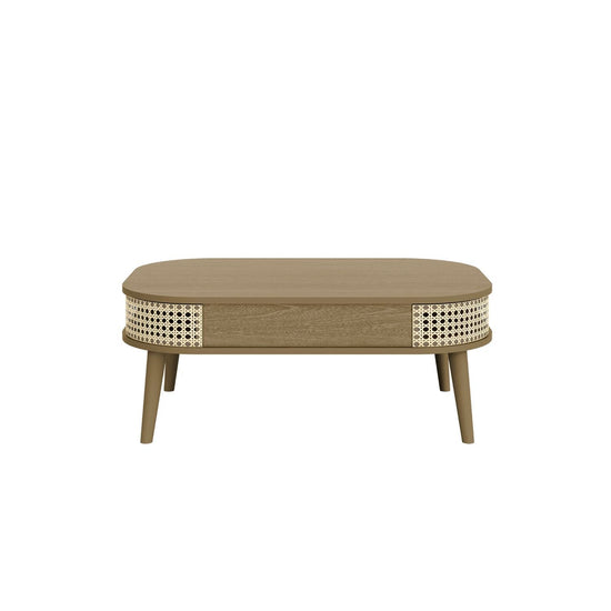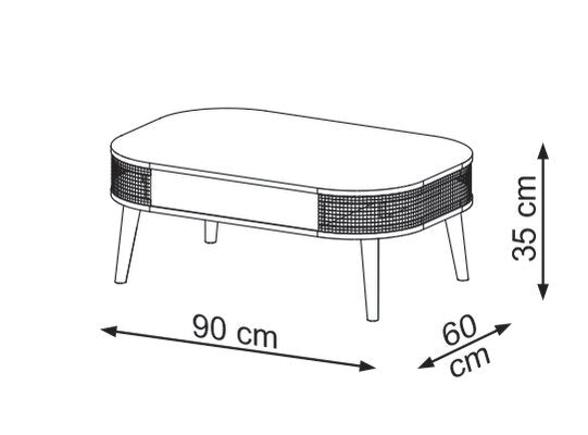 Mesa de centro elaborada en madera industrializada de pino con detalles de malla tejida que añade un elemento visual único y crea una textura interesante y sofisticada, brindando un equilibrio entre delicadeza y modernidad. Su amplia superficie ofrece espacio suficiente para colocar tus libros favoritos, revistas o cualquier otro objeto decorativo.