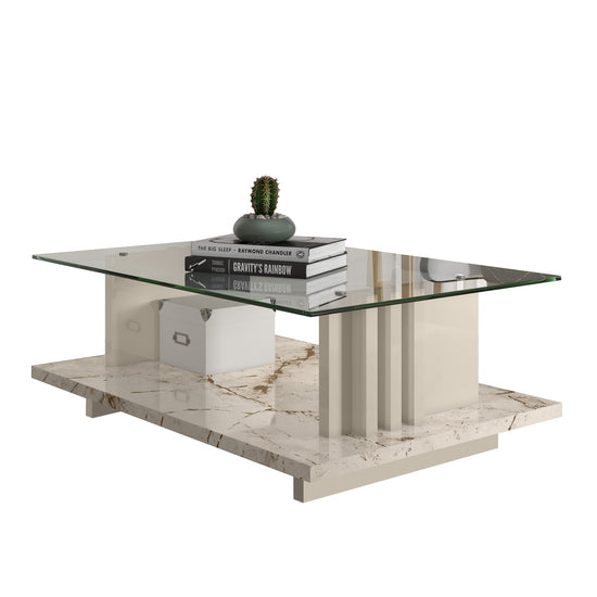 Mesa de centro elaborada en madera industrializada de pino con acabado UV, presenta un sofisticado diseño marmolado combinado con vidrio, que aporta un toque de elegancia y distinción a cualquier ambiente. Ideal para quienes buscan un mobiliario que combine estilo y funcionalidad.
