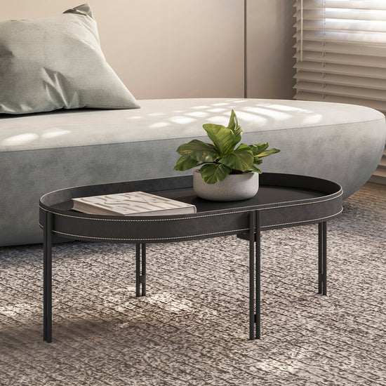 Mesa de Centro de diseño exclusivo. Su acabado en eurocuero le otorga una apariencia lujosa y distintiva, además es fácil de limpiar y mantener impecable. Patas metálicas que que le dan un toque perfecto para añadir modernidad y elegancia a cualquier espacio.