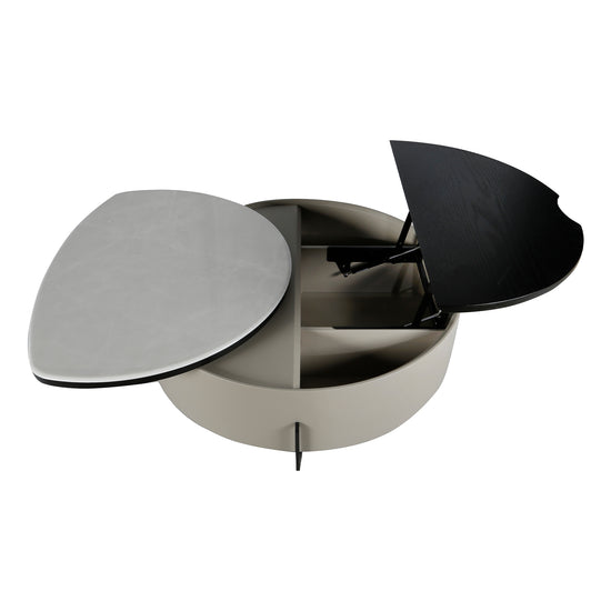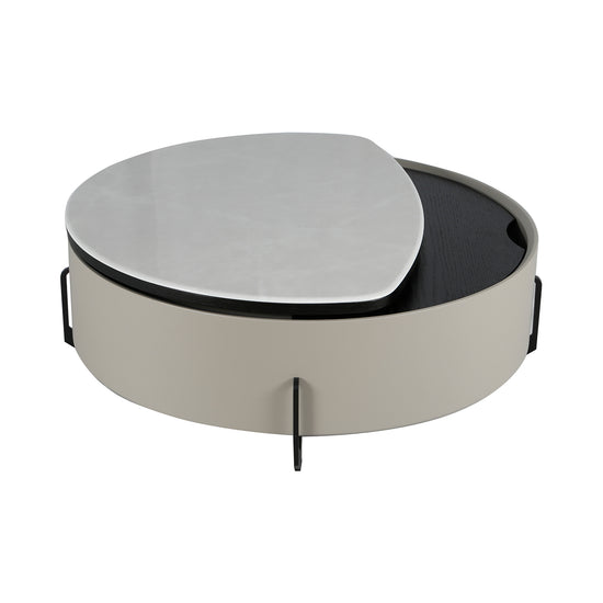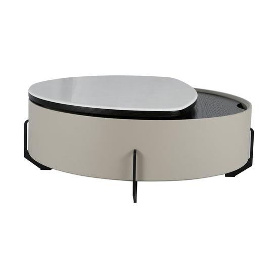 La Mesa de Centro Moscú Marmolizada Blanca redefine la funcionalidad con diseño de vanguardia. Su cubierta dividida en dos superficies abatibles facilita el acceso a un amplio espacio de almacenamiento interior. El acabado tipo mármol blanco aporta elegancia, mientras su forma redonda la convierte en el complemento ideal para salas modernas y sofisticadas.