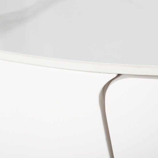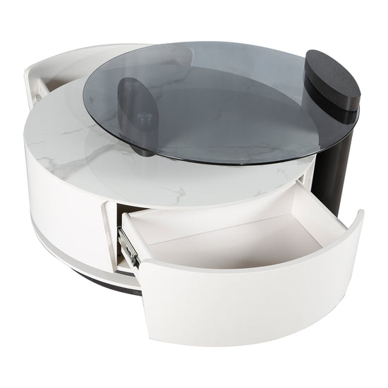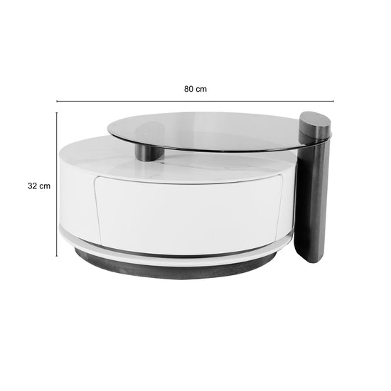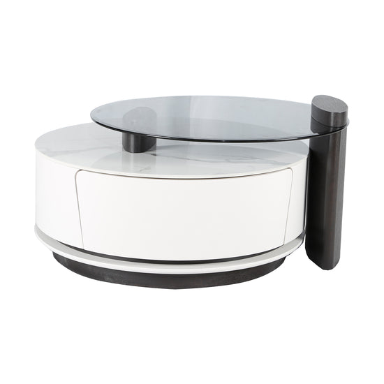 La Mesa de Centro Niki Marmolizada Blanca combina diseño contemporáneo y funcionalidad. Su cubierta redonda con acabado tipo mármol blanco añade un toque elegante, mientras el detalle en vidrio negro le da un contraste moderno y sofisticado. Incluye dos cajones curvos con rieles metálicos que ofrecen espacio de almacenamiento discreto, ideal para mantener tu sala organizada y con estilo.