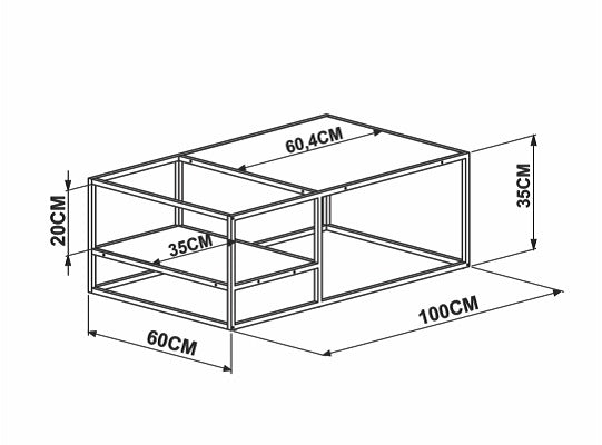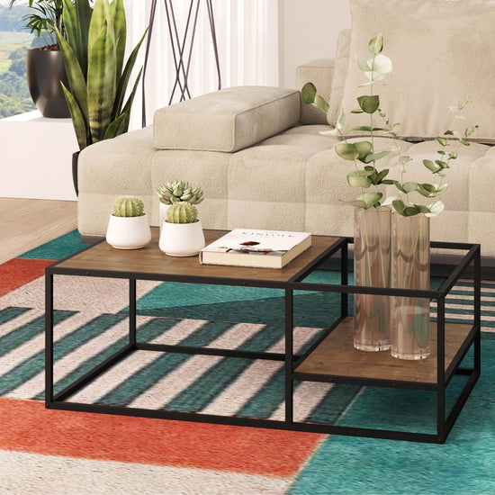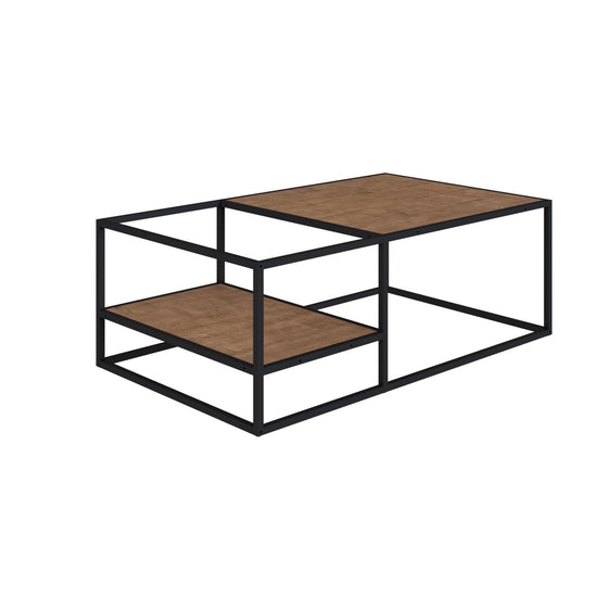 Mesa de centro elaborada en MDP de pino de 15mm. Revestimiento melamínico maderado texturizado, resistente a rayas y humedad. Estructura metálica de acero de 15x15mm, acabado en pintura epóxi.