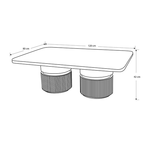 La Mesa de Centro Toscana de 120X80 cm destaca por su imponente cubierta marmolizada que aporta elegancia y modernidad. Su doble base cilíndrica en acabado champaña brinda estabilidad y un diseño sofisticado, convirtiéndola en el complemento ideal para realzar la decoración de tu sala.