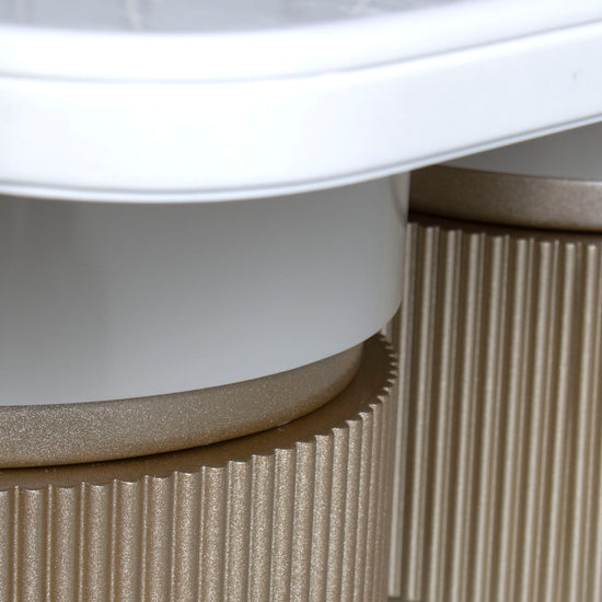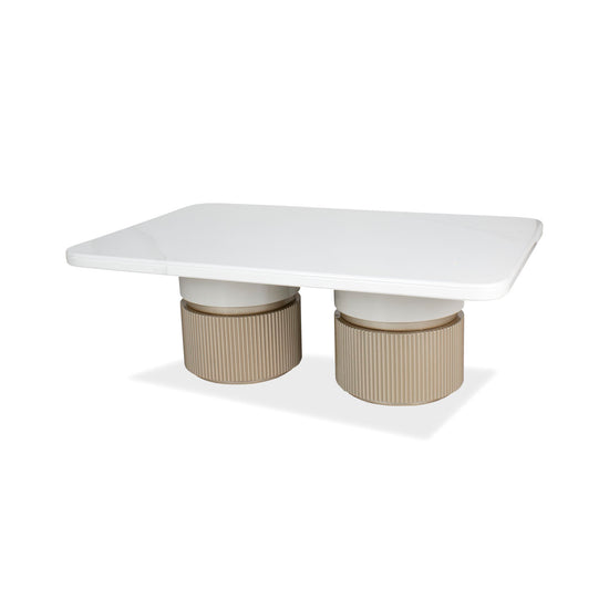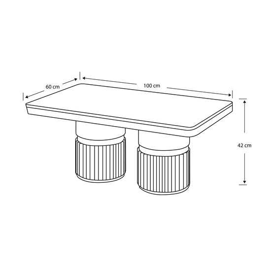 La Mesa de Centro Toscana destaca por su imponente cubierta marmolizada que aporta elegancia y modernidad. Su doble base cilíndrica en acabado champaña brinda estabilidad y un diseño sofisticado, convirtiéndola en el complemento ideal para realzar la decoración de tu sala.