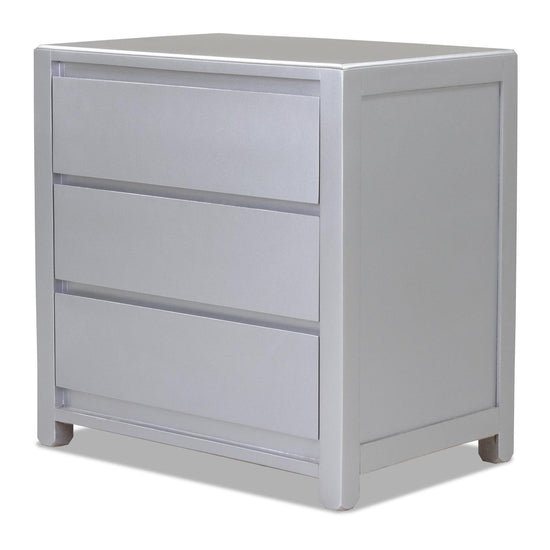 Nochero de tres cajones fabricado con materiales certificados, estructura en madera, pintura resistente color plata
